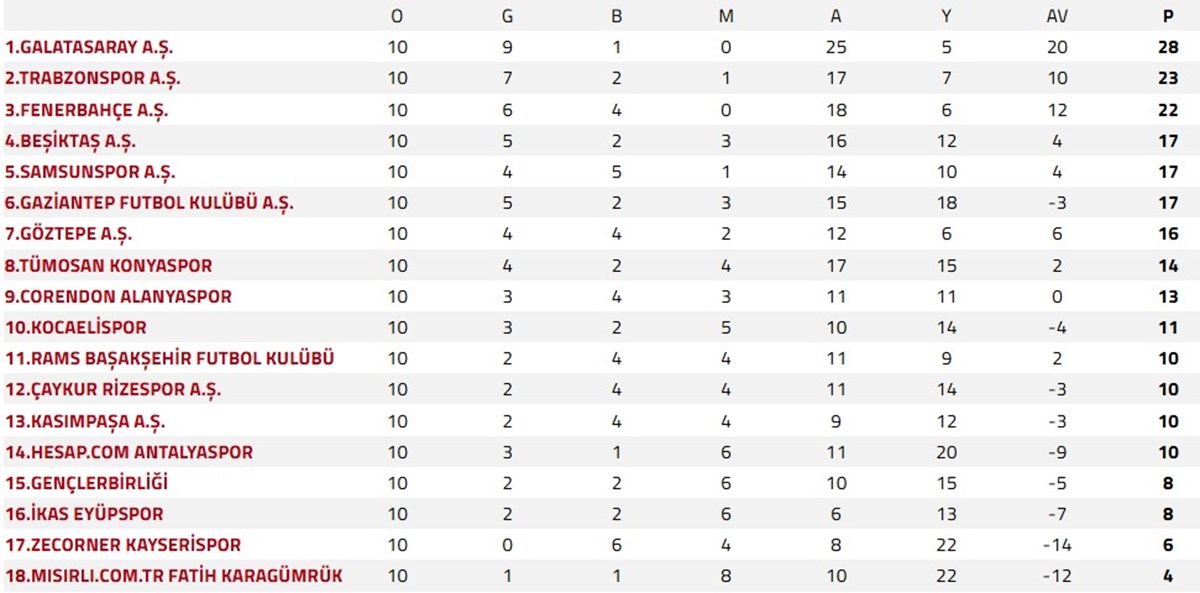 Trendyol Süper Lig'de 10. hafta 2 maçla sona erdi. Ligde haftanın kapanış gününde Samsunspor, Samsun Yeni 19 Mayıs Stadı'nda Çaykur Rizespor'u, Gaziantep FK ise Gaziantep Stadı'nda Fenerbahçe'yi konuk etti. Karadeniz derbisi 1-1 beraberlikle sonuçlanırken Fenerbahçe, Gaziantep deplasmanından 4-0'lık galibiyetle döndü. Göztepe'yi yenen Galatasaray, 28 puanla namağlup liderliğini sürdürdü. Sahasında ikas Eyüpspor'u 2-0'lık skorla geçen Trabzonspor, 23 puana yükselerek zirve takibini sürdürdü. Gaziantep FK deplasmanında farklı kazanan Fenerbahçe ise 22 puanla haftayı üçüncü sırada tamamladı. Beşiktaş, Samsunspor ve Gaziantep FK ise 17'şer puanla sıralandı. Sezonun 10. haftasının sonuçları, puan durumu ve 11. haftanın programı şöyle: SONUÇLAR Mısırlı.com.tr Fatih Karagümrük-Zecorner Kayserispor: 2-2 Kocaelispor-Corendon Alanyaspor: 2-0 Trabzonspor-ikas Eyüpspor: 2-0 Hesap.com Antalyaspor-RAMS Başakşehir: 0-4 Galatasaray-Göztepe: 3-1 Gençlerbirliği-TÜMOSAN Konyaspor: 1-2 Kasımpaşa-Beşiktaş: 1-1 Samsunspor-Çaykur Rizespor: 1-1 Gaziantep FK-Fenerbahçe: 0-4 11. HAFTA PROGRAMI Trendyol Süper Lig'in 11. haftası, iki büyük maça sahne olacak. Lider Galatasaray, 1 Kasım Cumartesi günü en yakın takipçisi Trabzonspor'u konuk edecek. 2 Kasım Pazar günü ise Beşiktaş-Fenerbahçe derbisi oynanacak. 31 Ekim Cuma: 20.00 RAMS Başakşehir-Kocaelispor (Başakşehir Fatih Terim) 1 Kasım Cumartesi: 17.00 Göztepe-Gençlerbirliği (Gürsel Aksel) 20.00 Galatasaray-Trabzonspor (RAMS Park) 2 Kasım Pazar: 14.30 TÜMOSAN Konyaspor-Samsunspor (MEDAŞ Konya Büyükşehir) 17.00 Zecorner Kayserispor-Kasımpaşa RHG Enertürk Enerji) 20.00 Beşiktaş-Fenerbahçe (Tüpraş) 3 Kasım Pazartesi: 20.00 ikas Eyüpspor-Hesap.com Antalyaspor (Stadı henüz açıklanmadı) 20.00 Corendon Alanyaspor-Gaziantep FK (Alanya Oba) 20.00 Çaykur Rizespor-Mısırlı.com.tr Fatih Karagümrük (Çaykur Didi)